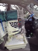 En route, her giant cage shakes like her cheapskate Mommy shorted her in the fine living department (in reality, her cage is 10 years old and birds as a whole do NOT like coming home to roost only to find there’s been a bit of a switcheroo) so of course Pearl alerts me to this fact.