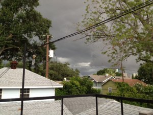 A summer rainstorm rolling in on the heels of a dark Houston sky.