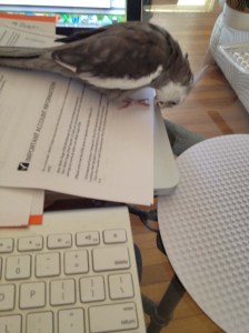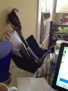And she gives herself carte blanche to supervise Mommy’s activities and offer her opinion on whether or not I am making good use of my time (“good use” roughly translating into any activity that involves food or feather scratching at the top of the list, and all other activities, including earning rent, below that).