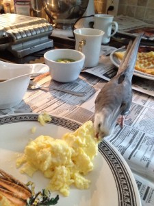 But whether I’m ready to face it or not, the moment a plate of delicious scrambled eggs appears, Pearl is on it.