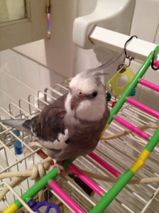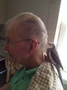 Pearl sitting quietly on her perch in the “Tall Tree” (aka my Dad).