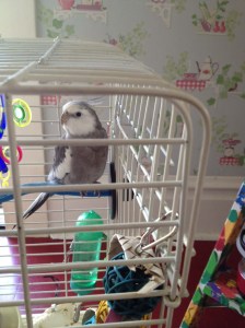 At all other times, putting her inside her cage and closing the door is a clear signal for her to start shrieking. No matter whether it is for her own safety, for punishment (if ever I have found one technique that DOESN’T work in communicating to this bird that she must cease and desist, caging her is it), or because she is tired and doesn’t yet realize it (cockatiels will be 2 until they are 22), she will shriek the moment the door closes.