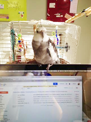 Let’s say his Mommy is busy trying to earn rent, and this activity requires her to use the flat folding thing with all the tasty clicking keys someone with feathers is so fond of (obsessed with).