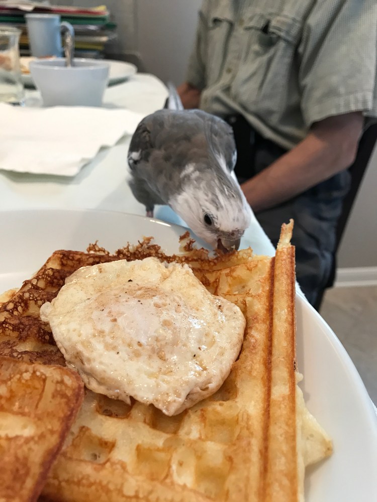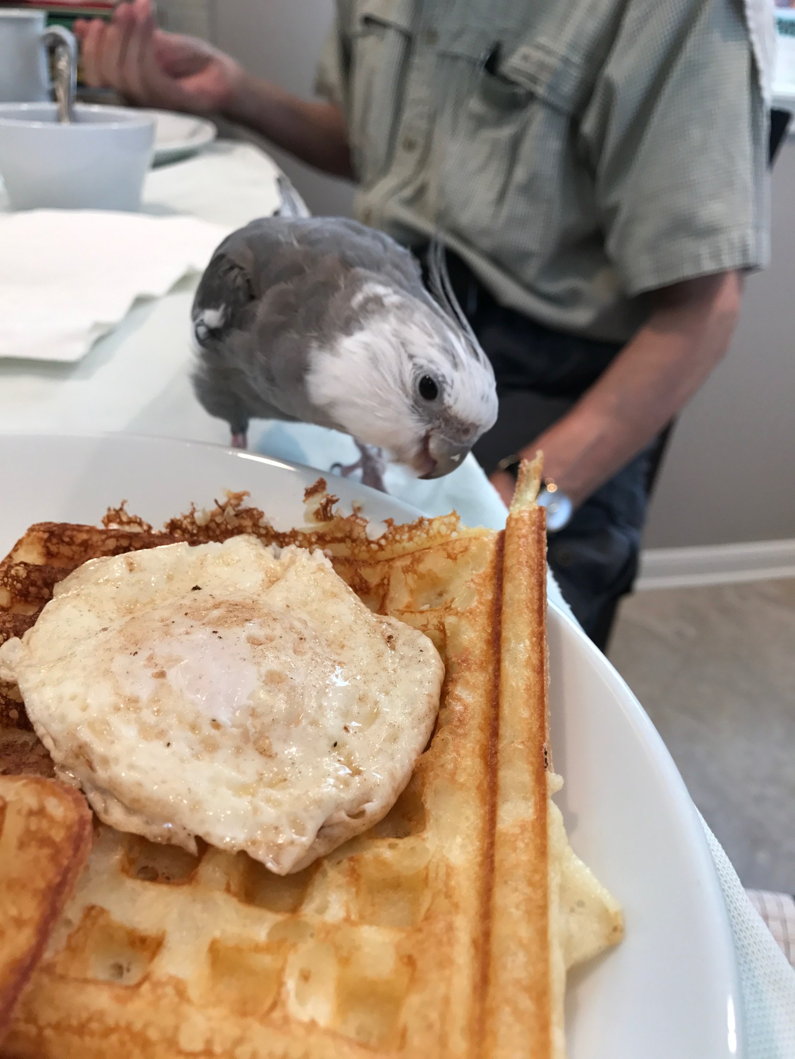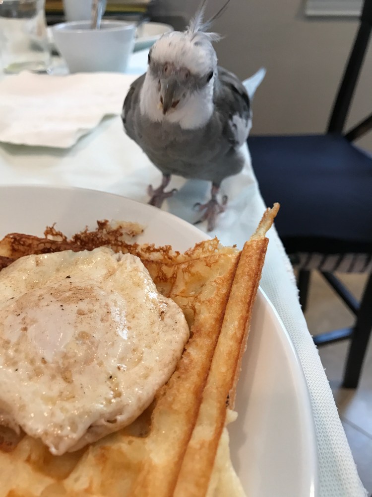 The mysterious large featherless being known only as “Mom” leans in closer and points the small rectangular flashing device she is holding right at the feathery star and the alleged “Egg McWaffle.”