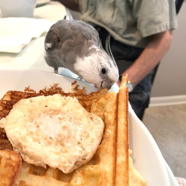 - The pure joy and excitement of her avian whenever he spies a waffle!