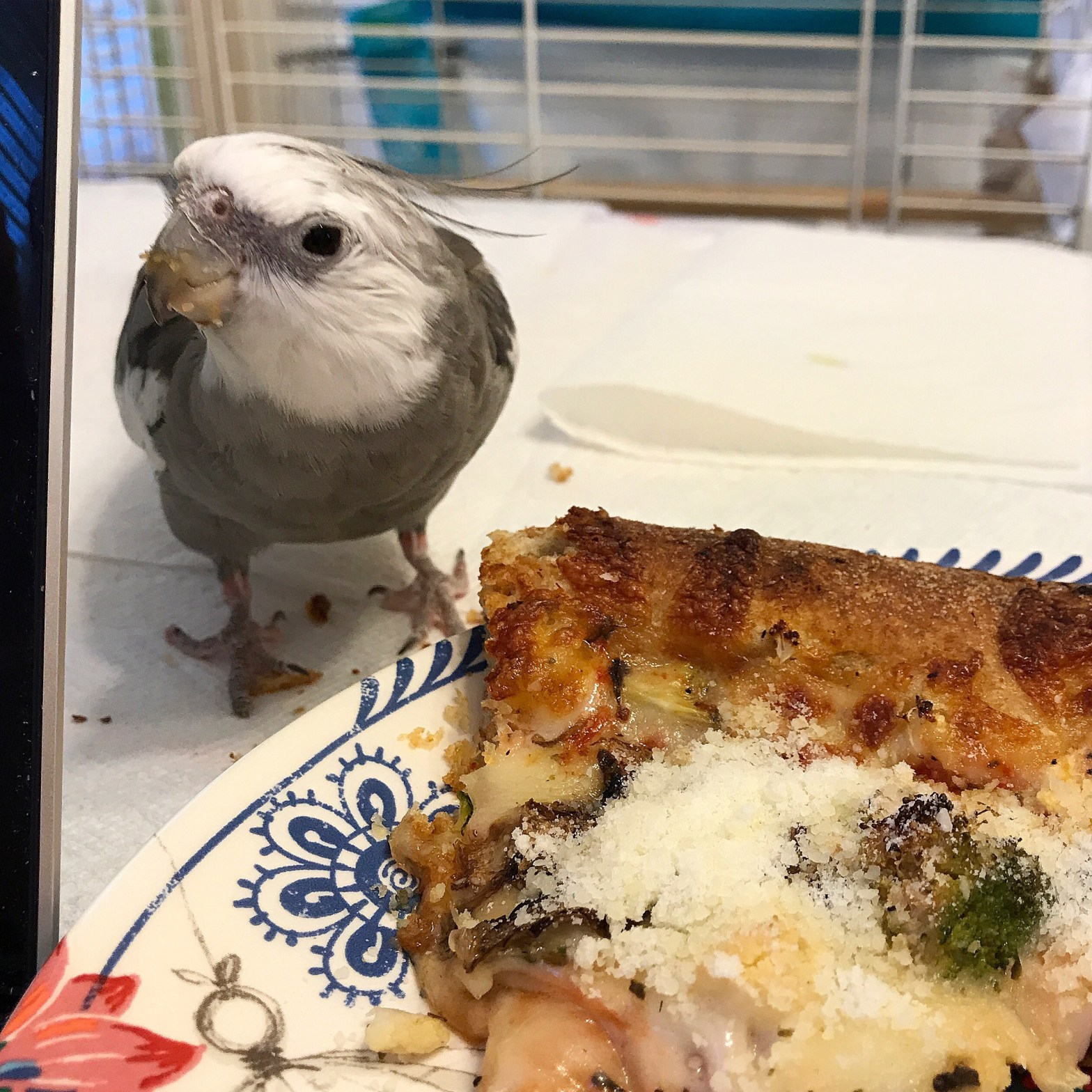 Then the flock member with feathers spies it. Now you have a willing (eager) dining accountability partner who will make sure the slice is evenly split between you.