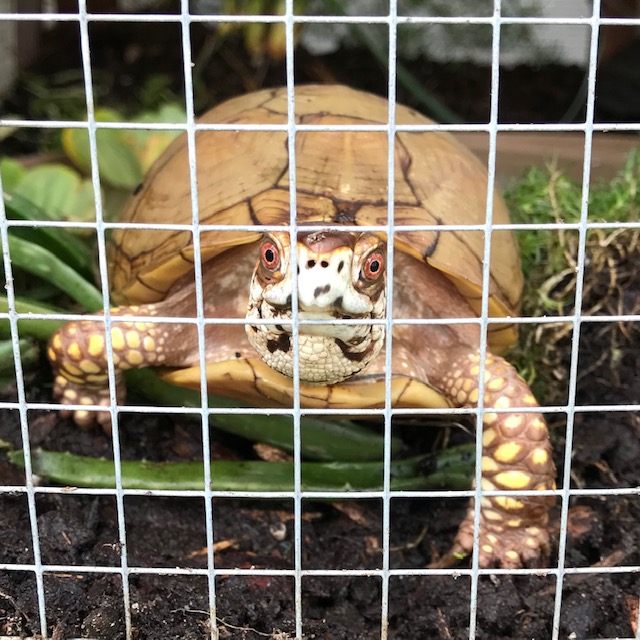 So instead we have made alternate arrangements. He has a secure yet roomy outdoor enclosure filled with natural plants, hay, hides, rocks, leaf litter, hollowed-out tree limbs and a spacious swimming hole. I have also created an additional secure enclosed play area nearby to let him stretch his legs daily.