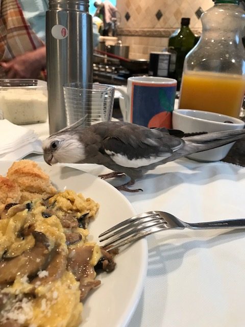 A feathered being with a very sensitive palate commences to evaluating his grandma’s newest culinary creation, with predictable results – his large featherless assistant can’t resist hovering (thankfully somehow he was still able to concentrate and deliver his highest rating of 5 feathers!)