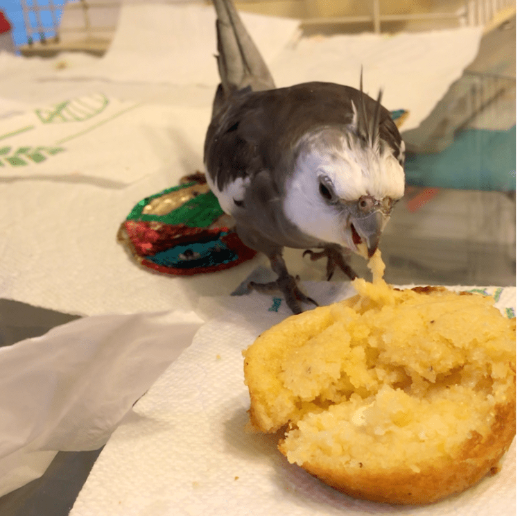 Pearl is enjoying eating a corn muffin great for breakfast or snack time you go my little friend 🐾💙🌻
