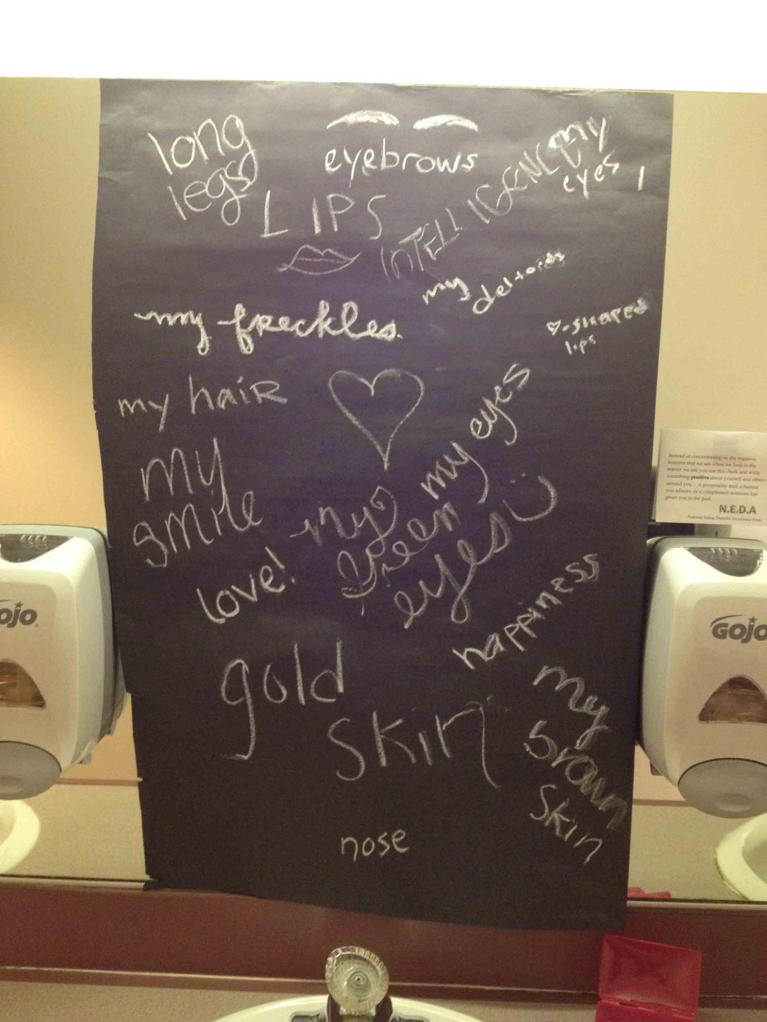 In addition to amazing hand-made banners and signs and lots of purple balloons, the students put up black paper over the bathroom mirrors and left chalk so students could write about what they love about their bodies!