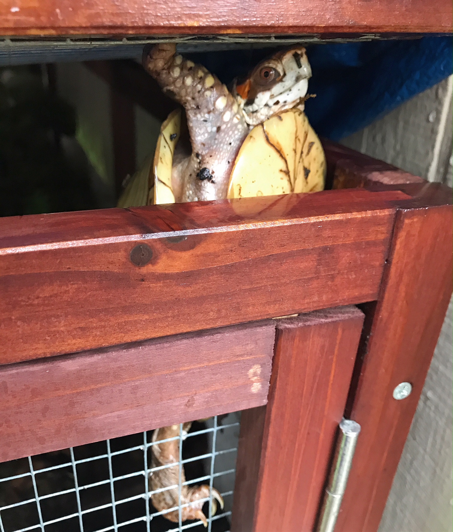 Bruce climbed UP the wire wall and actually pushed open the top of his enclosure – I had removed the weight that normally holds it closed to refresh his water and the next thing I knew…..!