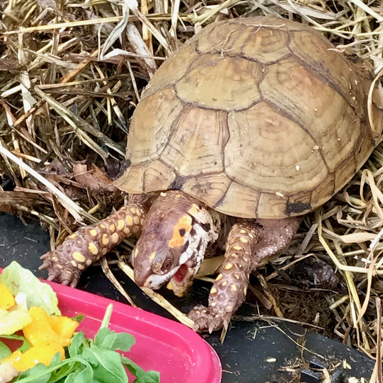 Newly awakened from hibernation and tucking into his first meal, Bruce “hunts” a stray piece of hay, mistaking it for a tasty earthworm.