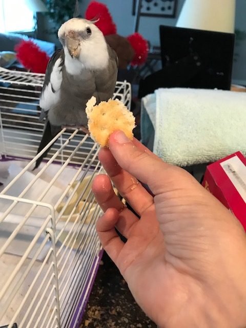 A very cute (and very full) feathered being poses for the paparazzi “with cracker” – in the interests of saving the planet.