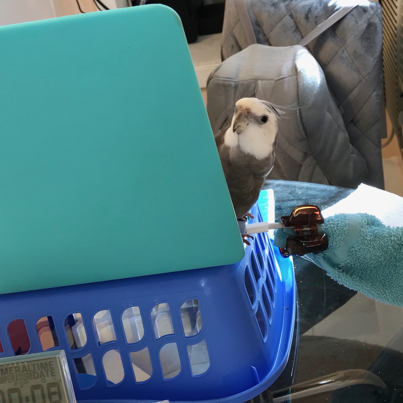 A feathery co-worker reminds his large featherless office mate of how grateful she is for the loan of his laptop to work on!
