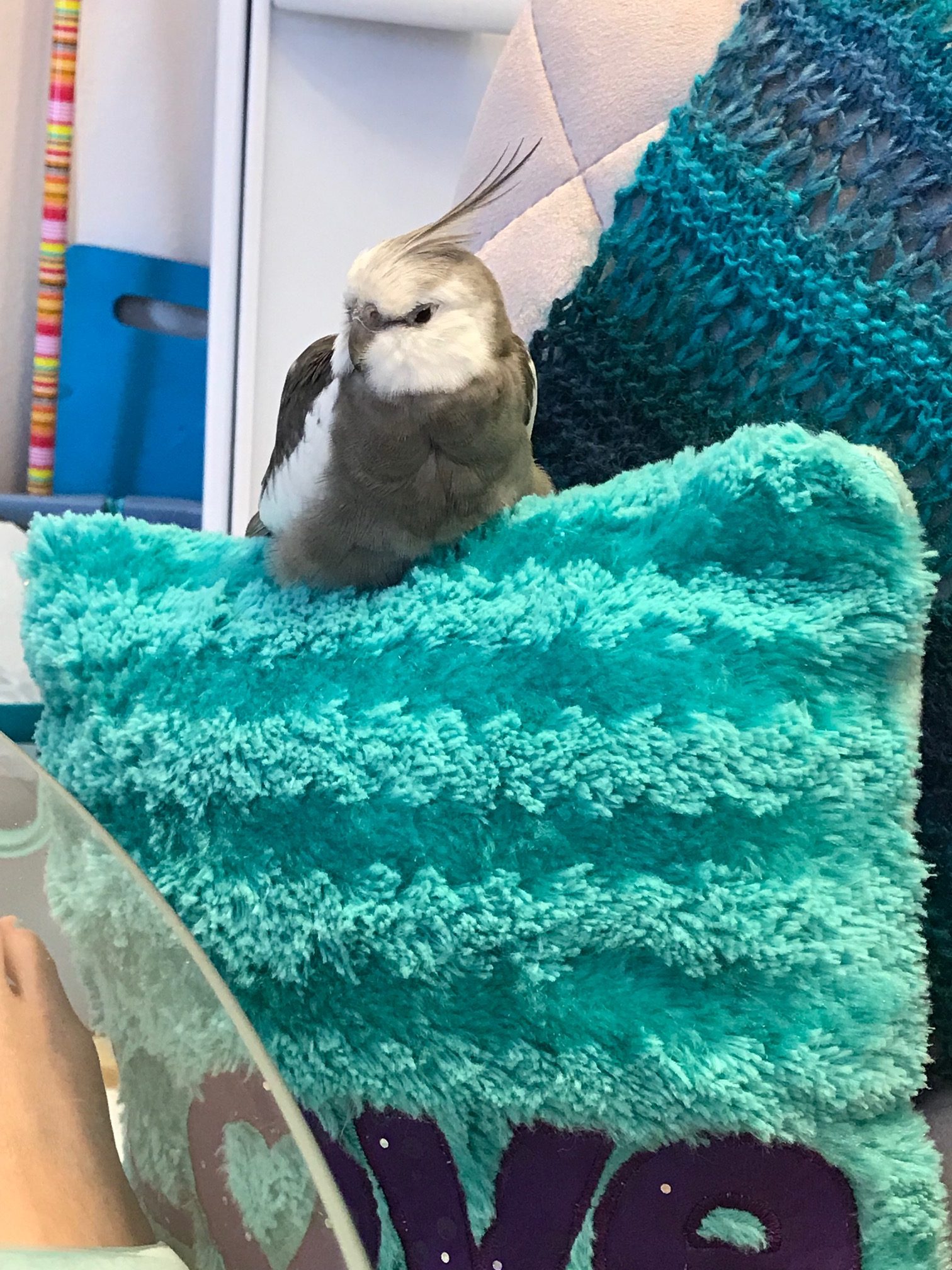 A feathered being uses “visual aids” to remind his large featherless assistant that it is time to take another restful nap together.