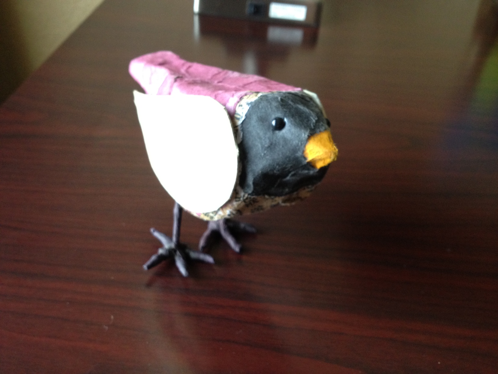 Side view. Very un-artfully named the “paper bird”, this tiny, featherweight creation is made entirely out of strips of (I am guessing) paper mache. The artist wasn’t on hand to personally discuss their work. Pity.