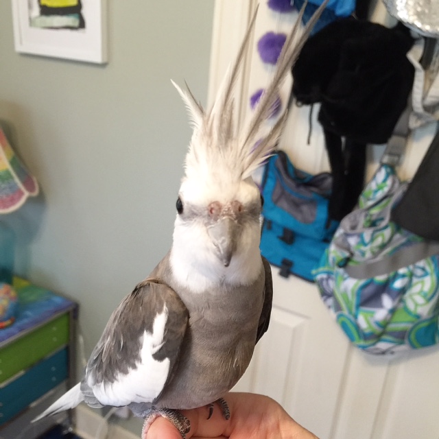 Pearl is a 16-year-old male whiteface cockatiel. He loves to eat waffles, but only if they are cooked by his personal Small Chef. He also has a great book out. It is called “Love & Feathers.”