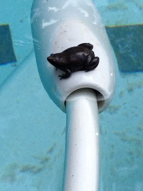 Of course when I saw him, clinging to the pool self-cleaner dealy, I had to perform my famous “pool frog rescue maneuver”.